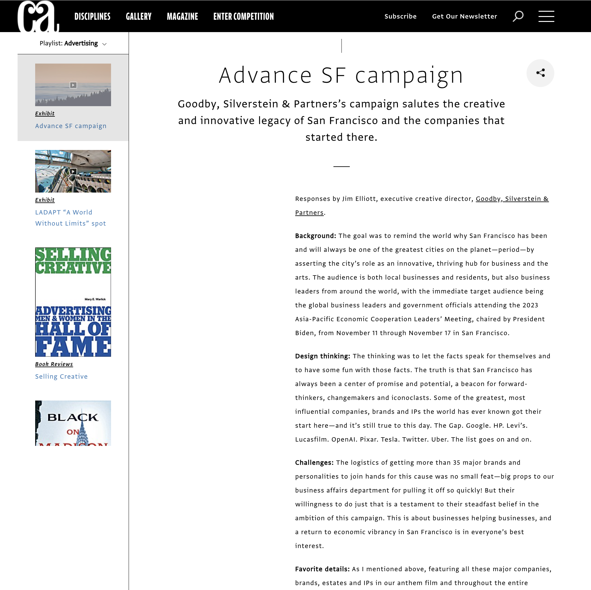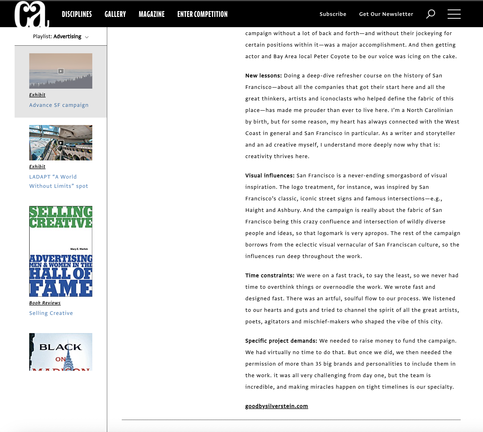 Veterans: Jack "Razor" Gillett, Jim "Zeke" Lloyd, Bill "Offender" Moir, and Elester "Hollywood" Latham. Goodby Silverstein & Partners Xfinity Jon Wolanske Felipe Lima James Horner Caroline Cappelli Ryan Tovani Chad Bettor Kirsten Tsitsos Michelle Kates Andrew Betoff Nikki Hendriks (Dietrich) Dong Thai Kelly Evans-Pfeifer Adam Arola PhD MBA Lyniece Hill Maren Severtson Shneur Silverstein Jim Haight Nick Miller Jackie Nelms Judy Ybarra Brittany Paredes Benny Gold Dustin Hayes Rose Holden SMUGGLER preymaker EXILE Edit Lime Studios