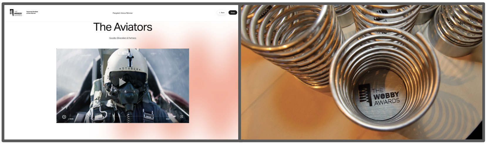 Massive thanks to the peoples of the internet for voting The Aviators the winner in Video & Film Scripted (Branded) at the The Webby Awards. And huge congrats to these amazing people below (including, first and foremost, our featured veterans) for coming together to bring this idea to life so beautifully: